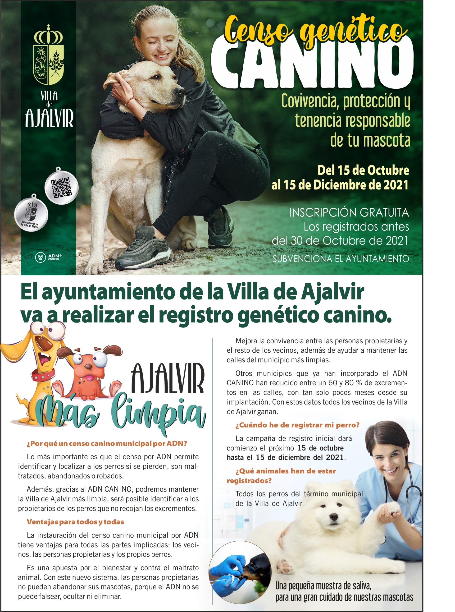 El pasado día 15 de octubre se inicio la campaña de identificación genética canina, desde el Ayuntamiento de Ajalvir insistimos en la obligatoriedad de tener a todos los perros del municipio registrados en el censo municipal de animales domésticos como así se refleja en el BOCM publicado el 19 de diciembre del 2003, de ordenanza fiscal municipal reguladora de la tenencia de perros y otros animales domésticos, TÍTULO VIII, art. 43. Y la importancia de realizar la prueba de recogida de saliva para el ADN.