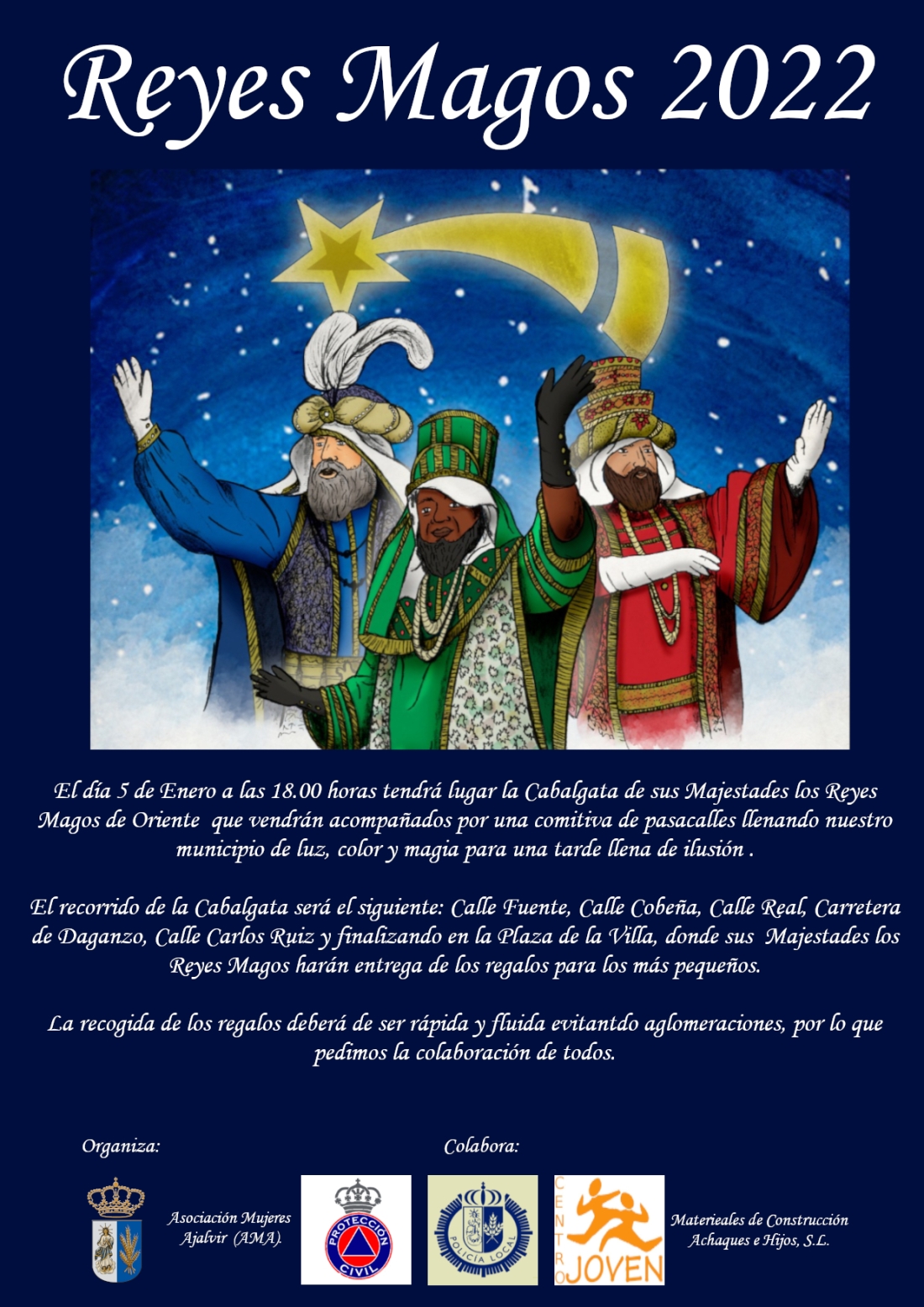 El próximo día 5 de Enero a partir de las 18:00 horas, tendrá lugar la tradicional cabalgata de sus Majestades los Reyes Magos de Oriente. Debido a la situación actual este año hay algunas variaciones, no se tirarán caramelos durante el recorrido de esta, deberán hacer uso obligatorio de la mascarilla y evitar las aglomeraciones. Se recomienda ver la cabalgata desde las aceras por las calles que se tiene previsto el recorrido.