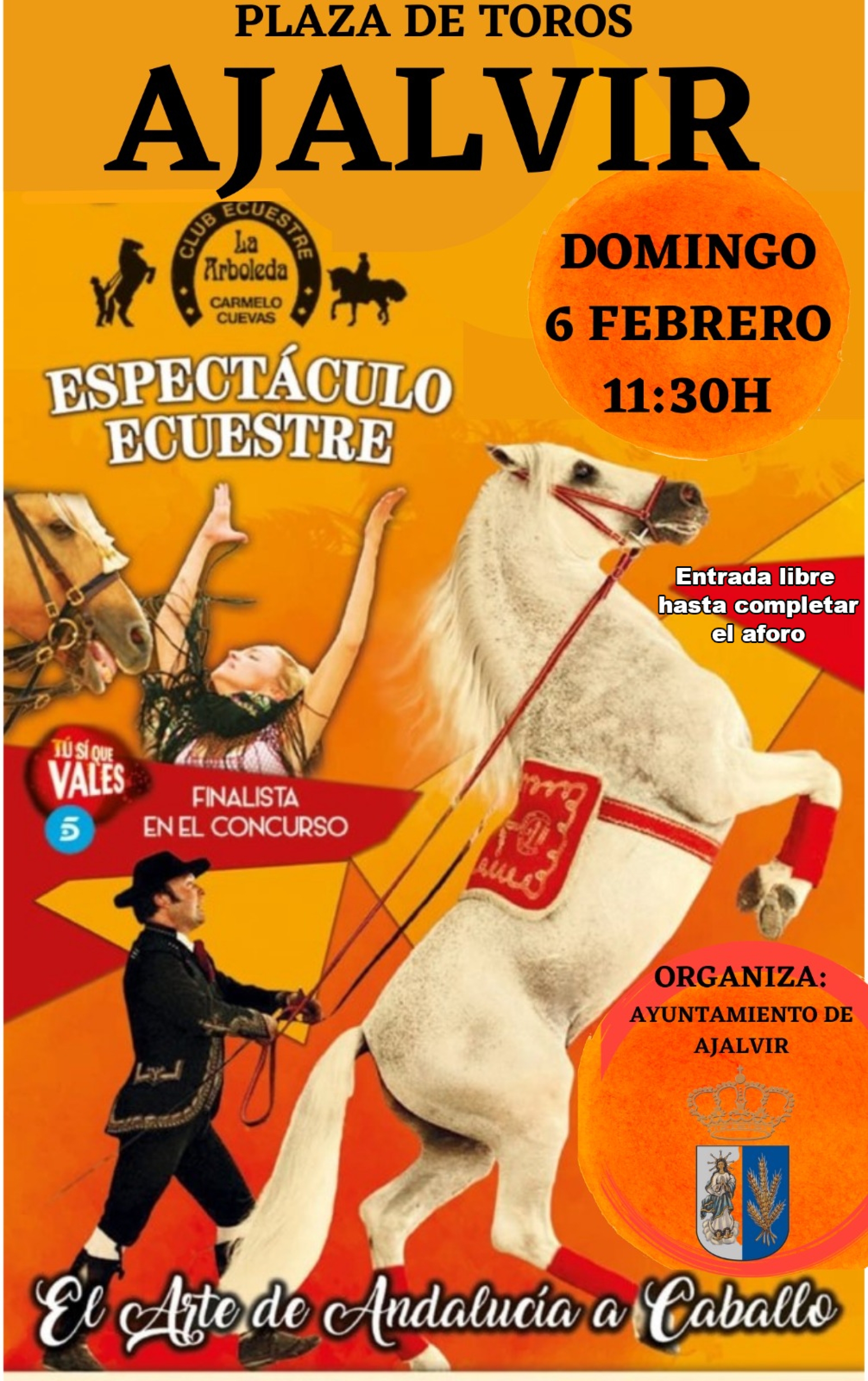 El domingo día 6 en la Plaza de Toros Espectáculo Ecuestre a las 11:30h.Hasta completar aforo. Las entradas se facilitaran antes del comienzo del espectáculo en la Plaza de Toros .