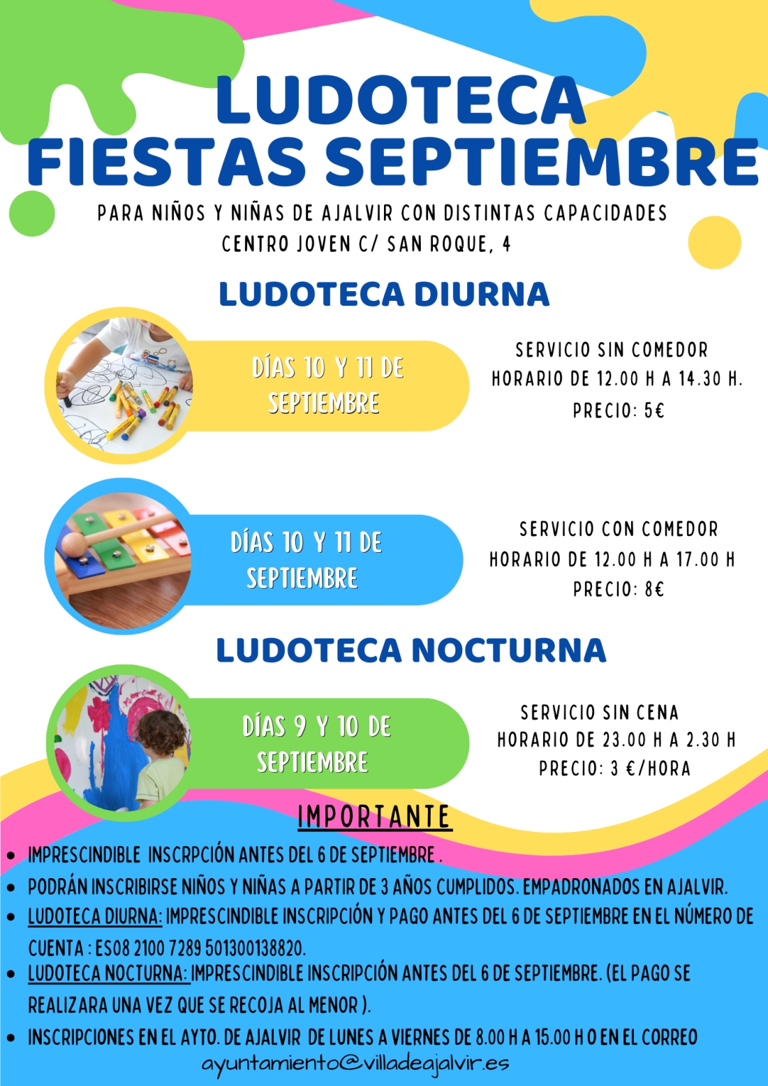 LUDOTECA FIESTAS SEPTIEMBRE Jueves, 25 Agosto 2022 12:50 Publicado en Educacion y Cultura Imprimir Email Artículos relacionados (por etiqueta) LUDOTECA FIESTAS SEPTIEMBRE 2025 LUDOTECA CURSO ESCOLAR 24-25 LUDOTECA FIESTAS SAN BLAS 2024 DIAS VERDES CURSO 23/24 LUDOTECA LA ESPIGA 2023 volver arriba