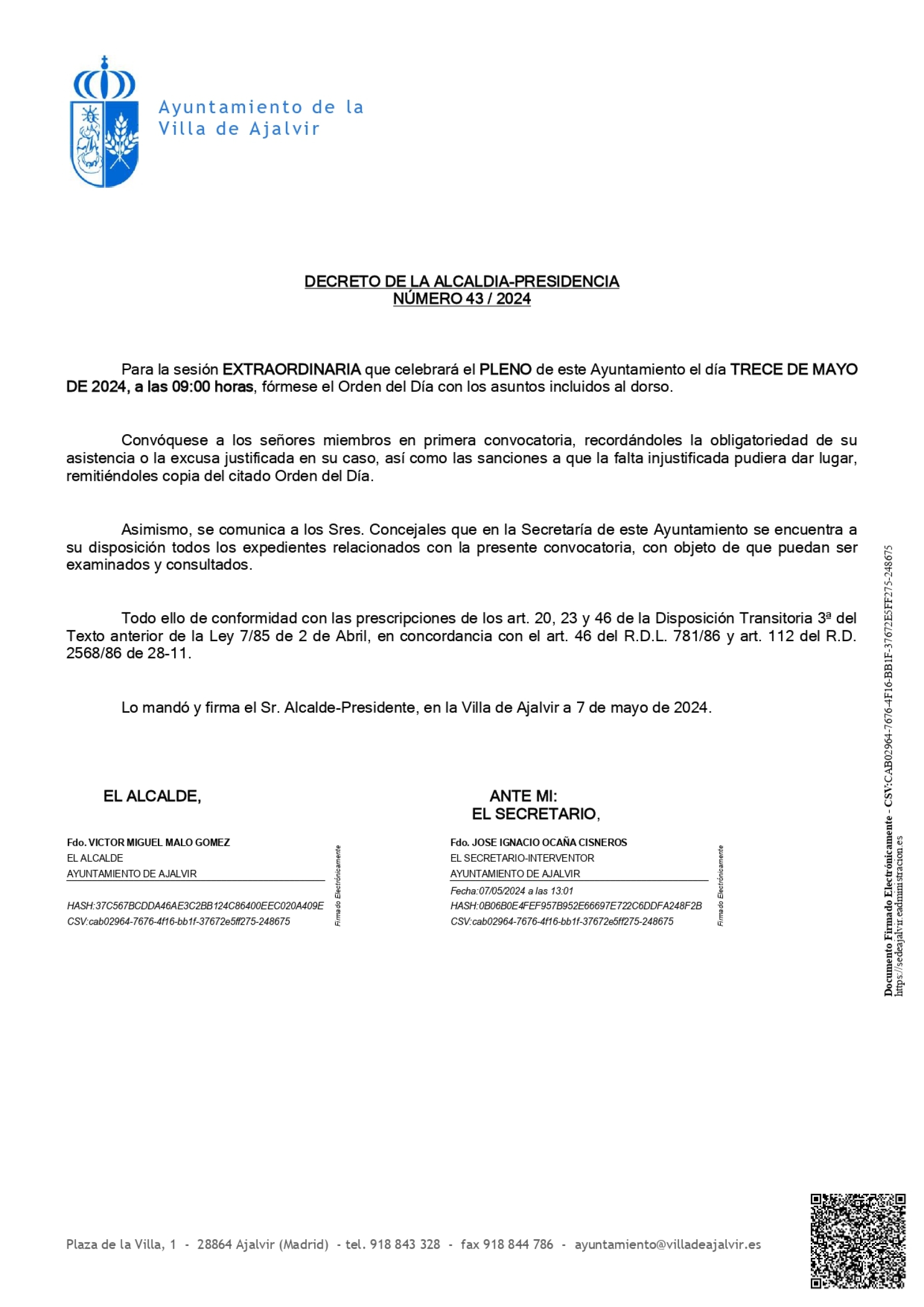 El próximo lunes 13 de mayo del 2024, tendrá lugar el Pleno Extraordinario a las 9:00 a.m. horas en el Salón de Plenos del Ayuntamiento.