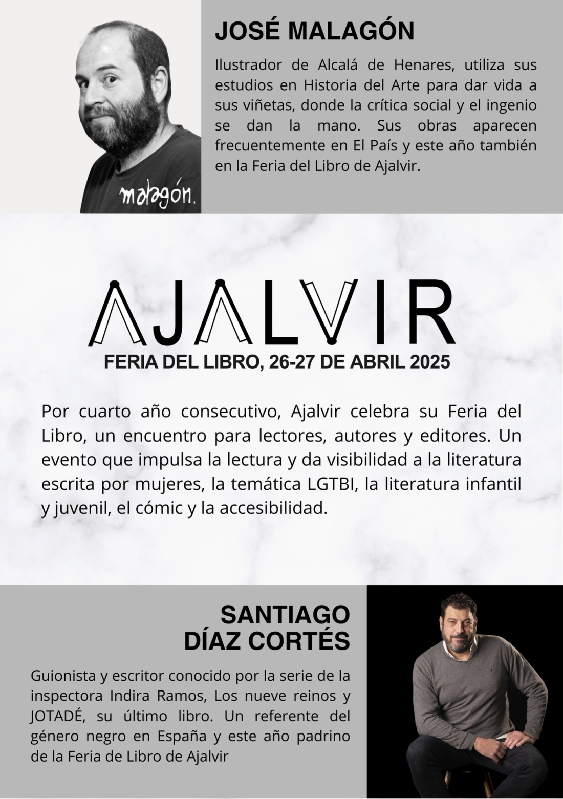 Recordamos que la feria comenzará este sábado 26 de abril a las 11:00 de la mañana con la inauguración oficial, en la que tendremos el honor de contar con nuestro padrino de honor, Santiago Díaz Cortés.