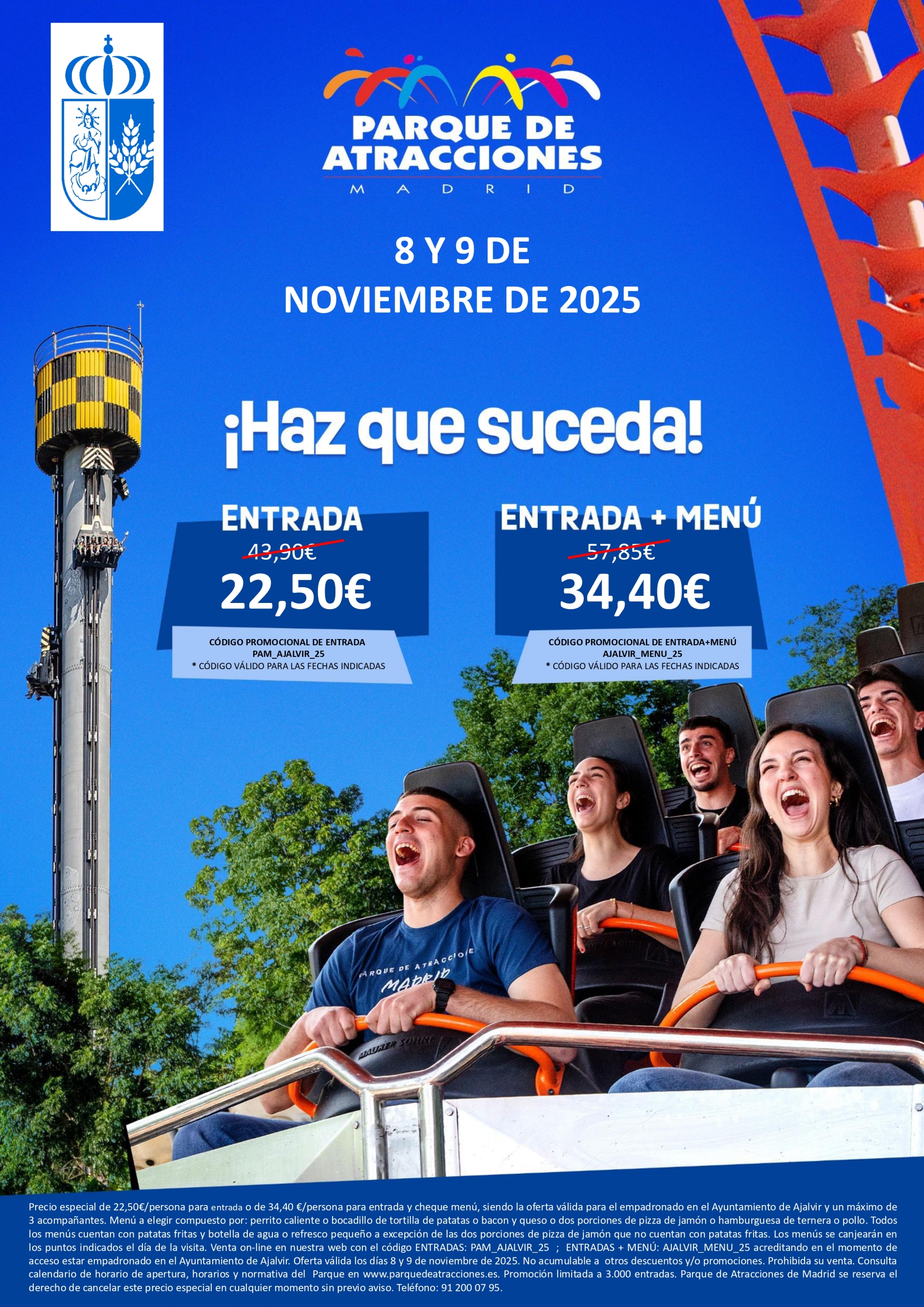 Los próximos días 8 y 9 de noviembre los vecinos de Ajalvir podrán disfrutar de descuentos especiales en el Parque de Atracciones de Madrid.