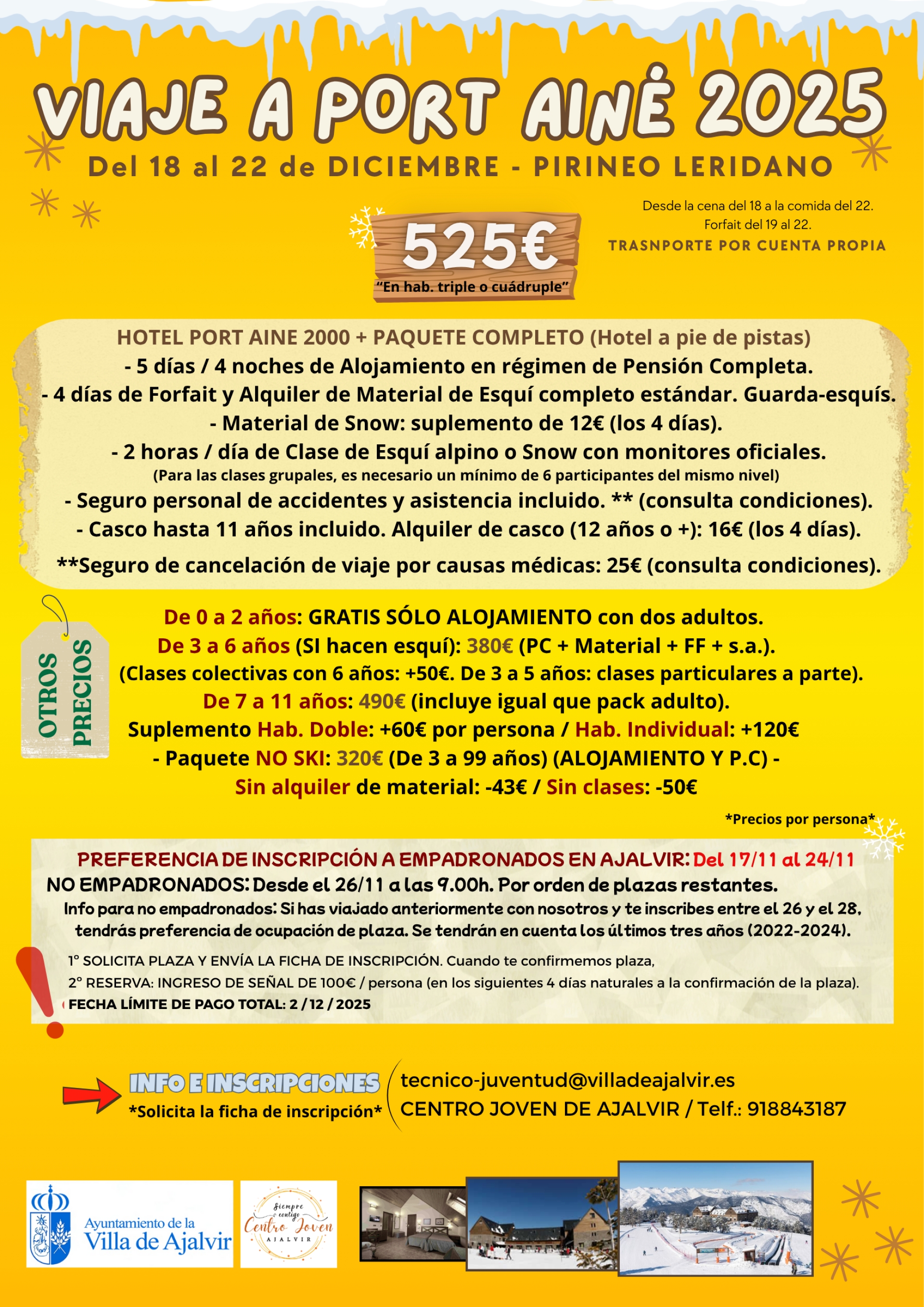 El Ayuntamiento de Ajalvir, desde el Centro Joven, organiza su tradicional viaje a la nieve a la estación de Port Ainé, en el Pirineo Leridano, del 18 al 22 de diciembre. Una estación conocida por los habituales a este viaje y que destaca por estar a pie de pistas y por su gran confort para los esquiadores.