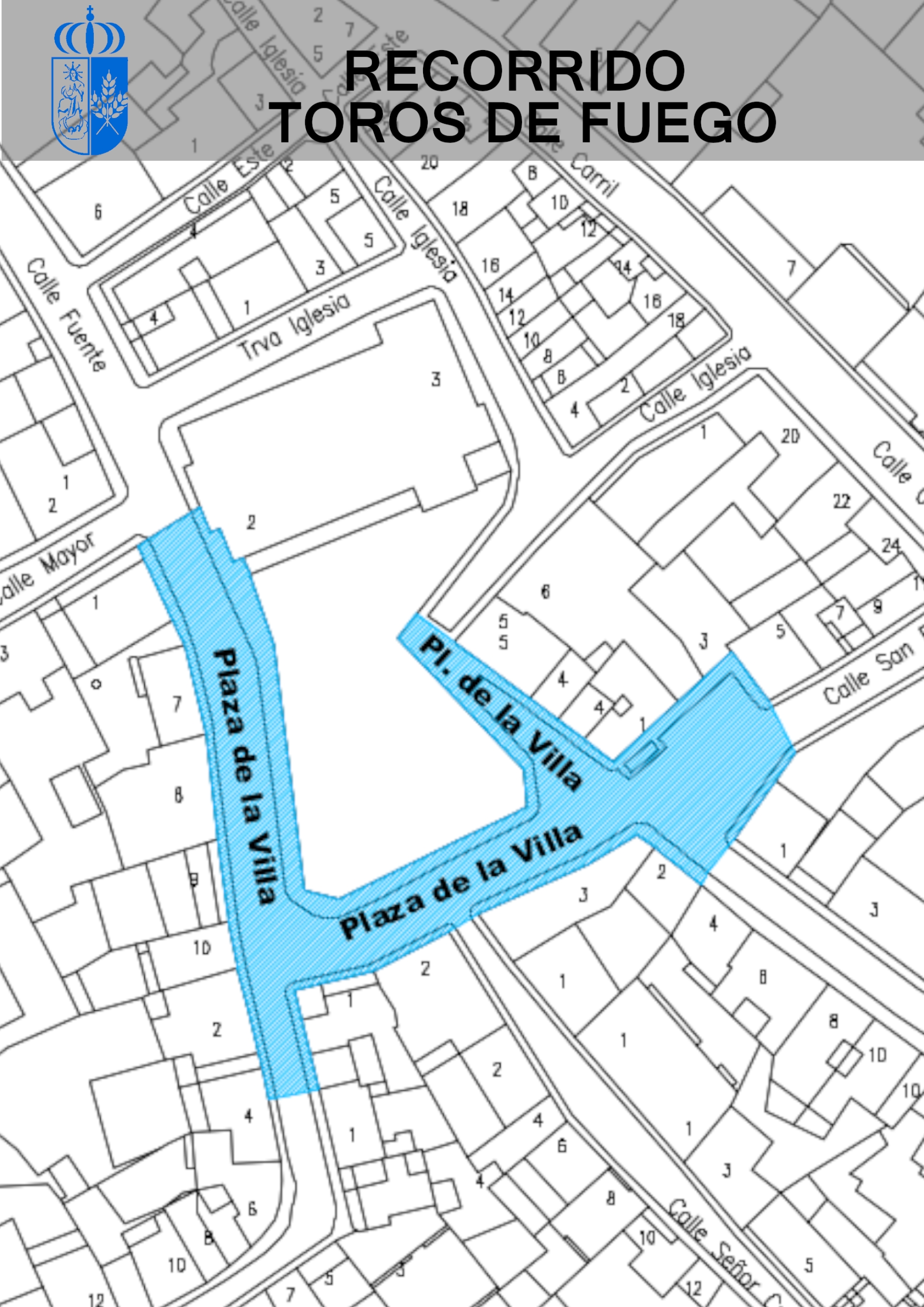 Plaza de la Villa con limite en puerta de la Iglesia; Plazoleta La Solana con limite en esquina C/ San Roque; inicio C/ El Cura; inicio C/ Carlos Ruiz; salida toros C/ Fragua.