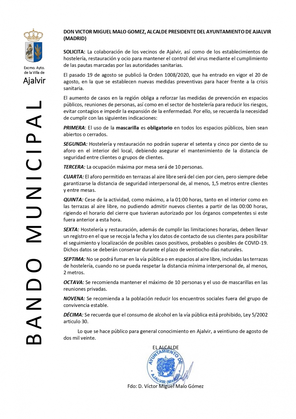 SOLICITA: La colaboración de los vecinos de Ajalvir, así como de los establecimientos de hostelería, restauración y ocio para mantener el control del virus mediante el cumplimiento de las pautas marcadas por las autoridades sanitarias.