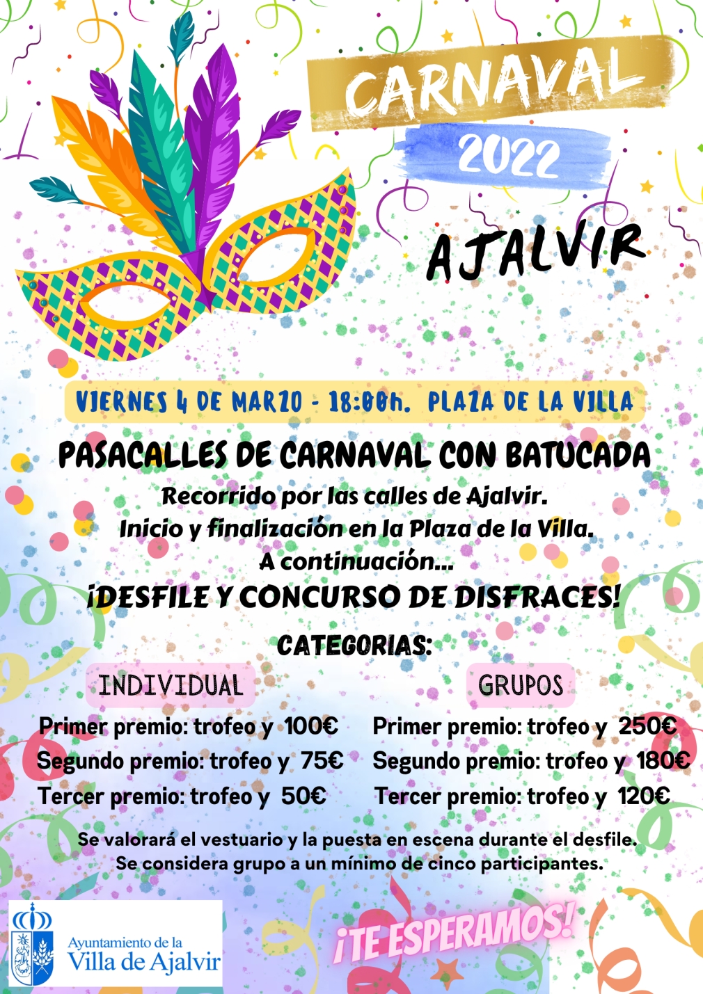 Os recordamos que mañana a las 18:00 horas os esperamos en la Plaza de la Villa, para que nos acompañéis en el pasacalles de Carnaval. Recorreremos con nuestros disfraces mas divertidos las calles de nuestro municipio junto con la batucada “Samba con Arte “. Después tendremos un desfile y concurso de disfraces.